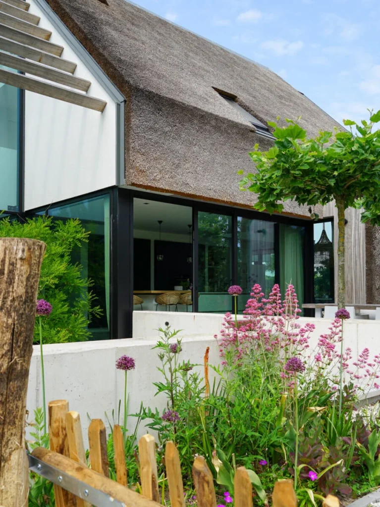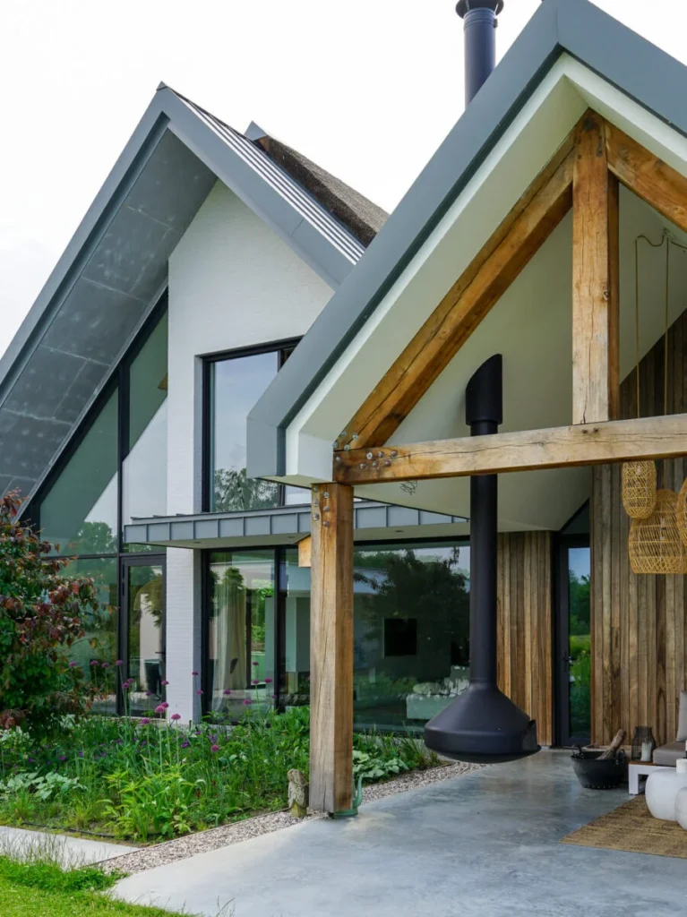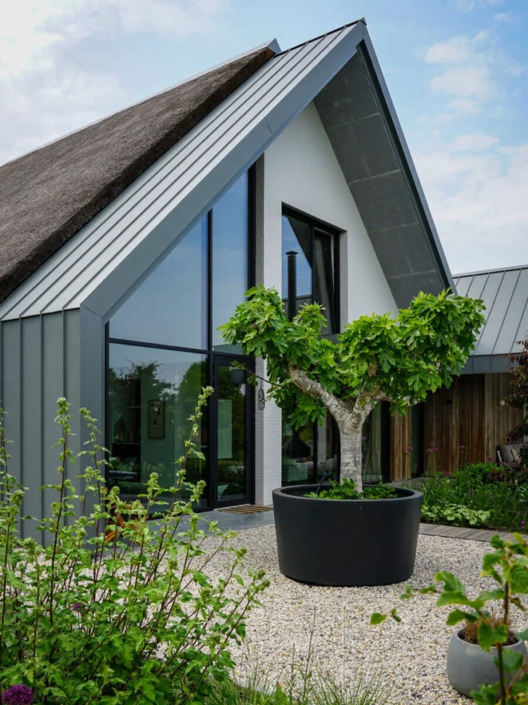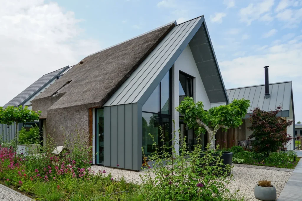 Deze schuurwoning bouwden we in Nuenen. Een plaatje van een woning met diverse materialen in de dak- en gevelbekleding. Dat geeft een erg fraai karakter aan de woning. Met een aluminium vliesgevel/lichtstraat, veel glas én riet. En met een strakke steen, wit keimwerk, padoek gevelbekleding én eiken balken.