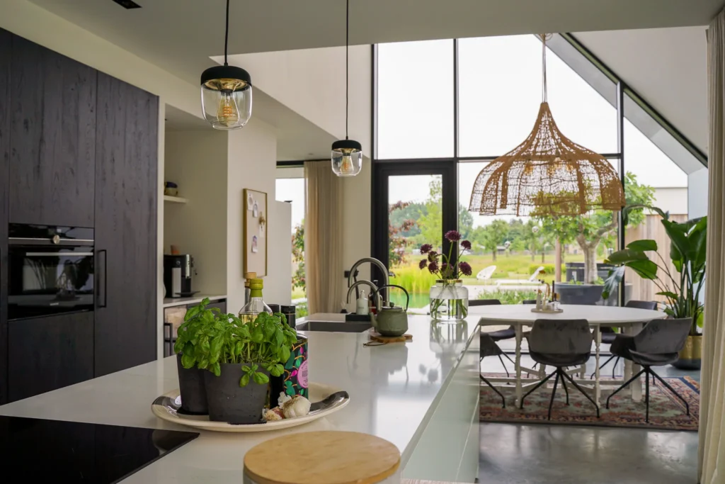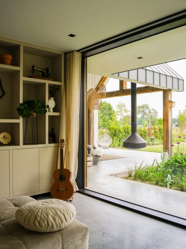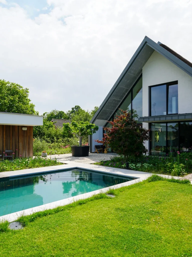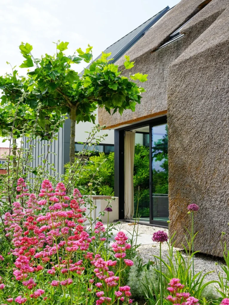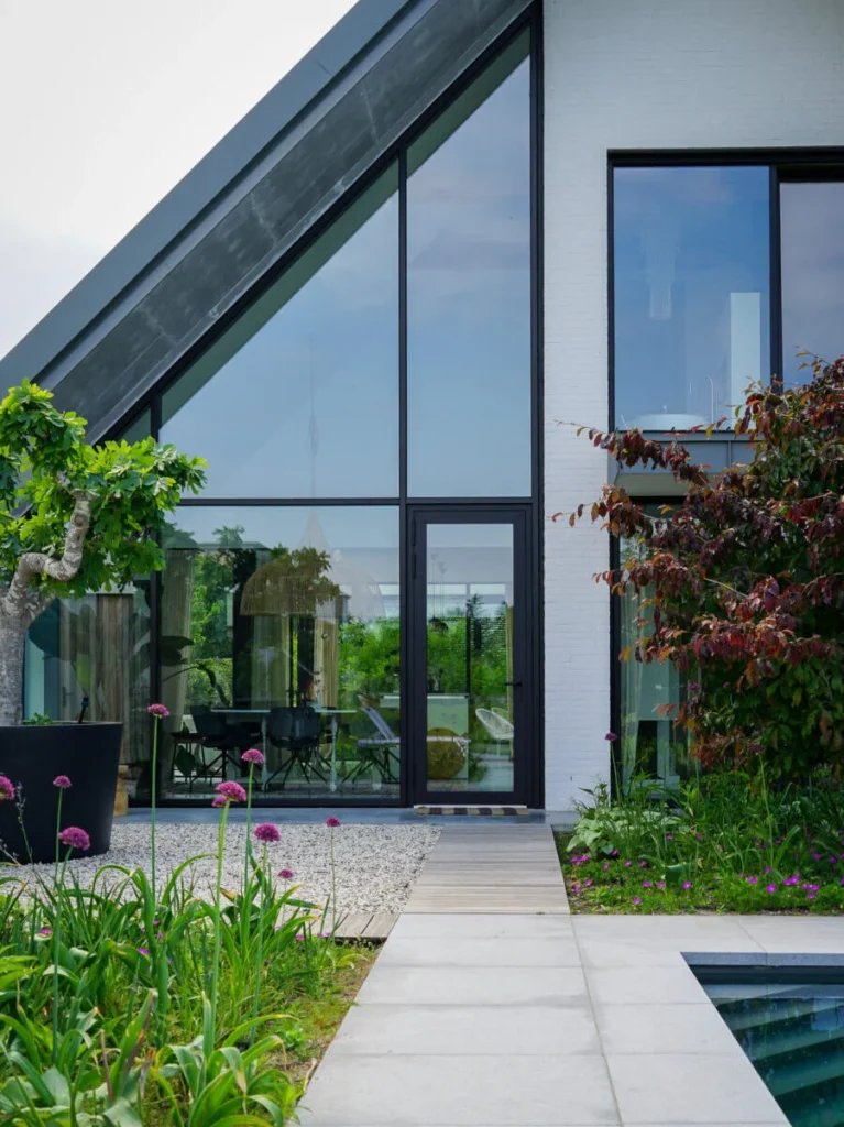 Deze schuurwoning bouwden we in Nuenen. Een plaatje van een woning met diverse materialen in de dak- en gevelbekleding. Dat geeft een erg fraai karakter aan de woning. Met een aluminium vliesgevel/lichtstraat, veel glas én riet. En met een strakke steen, wit keimwerk, padoek gevelbekleding én eiken balken.