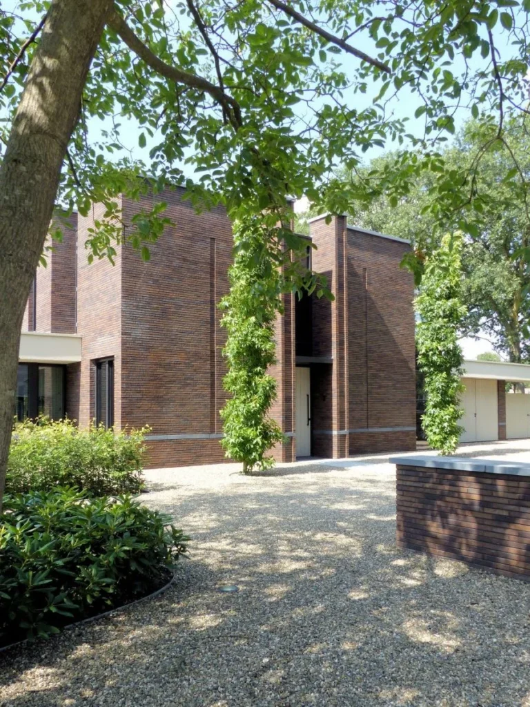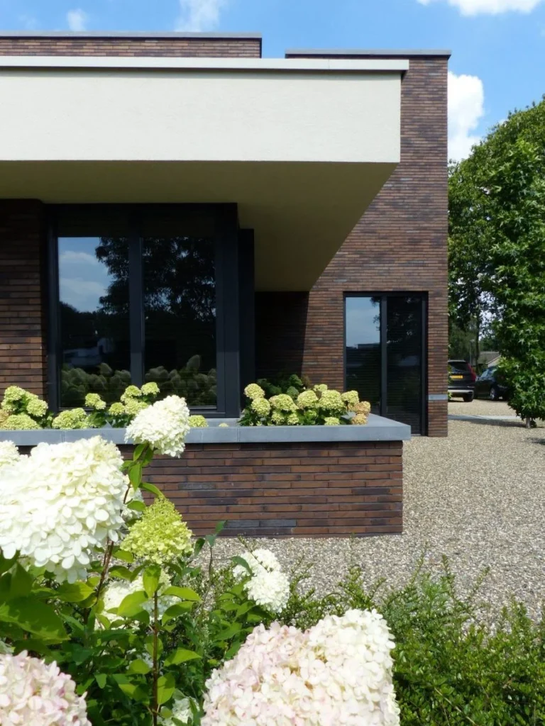 Een moderne villa in Brabant met strakke, rechte lijnen in het metselwerk en overige elementen. Deze prachtige villa is geïnspireerd op de beroemde architectuur van Frank Lloyd Wright.