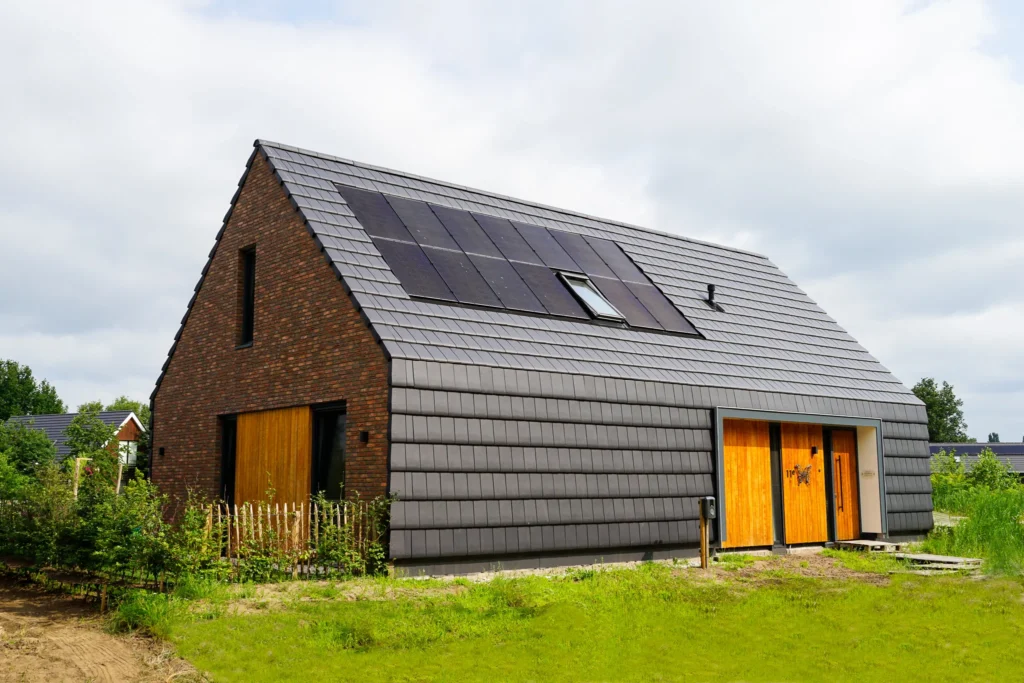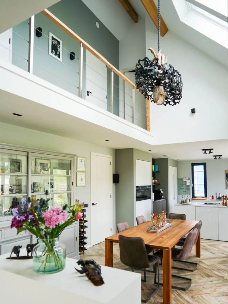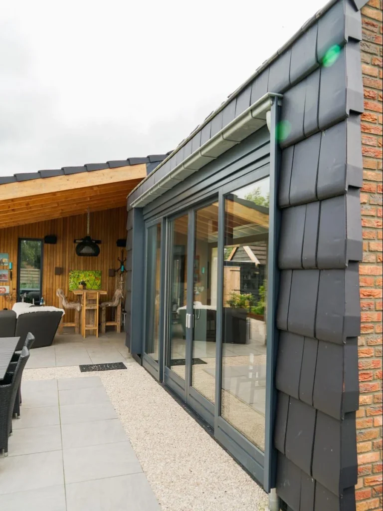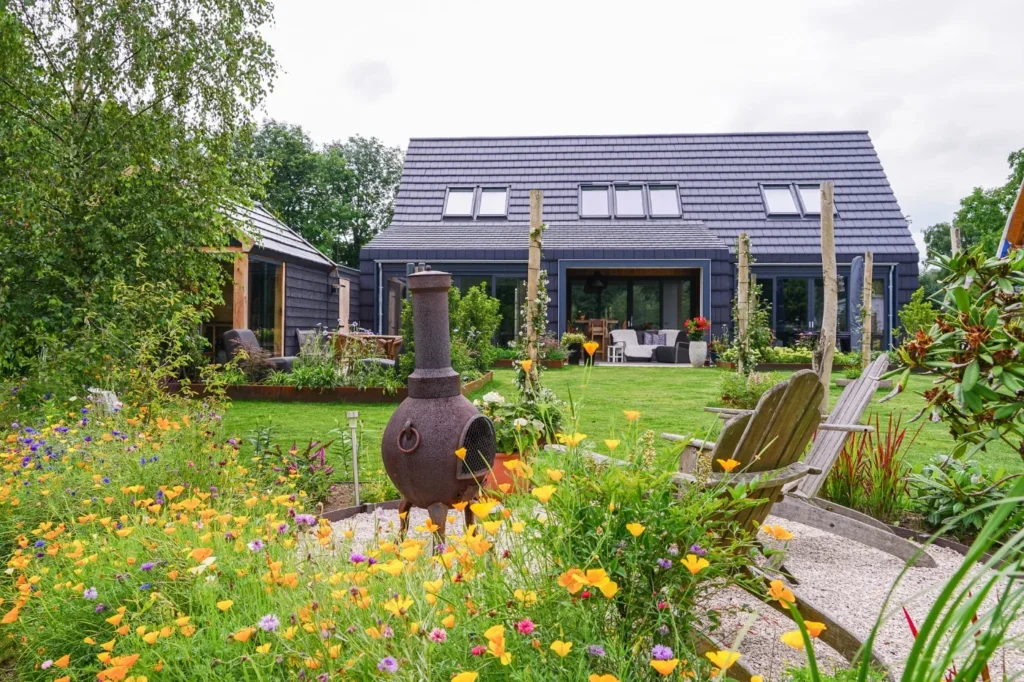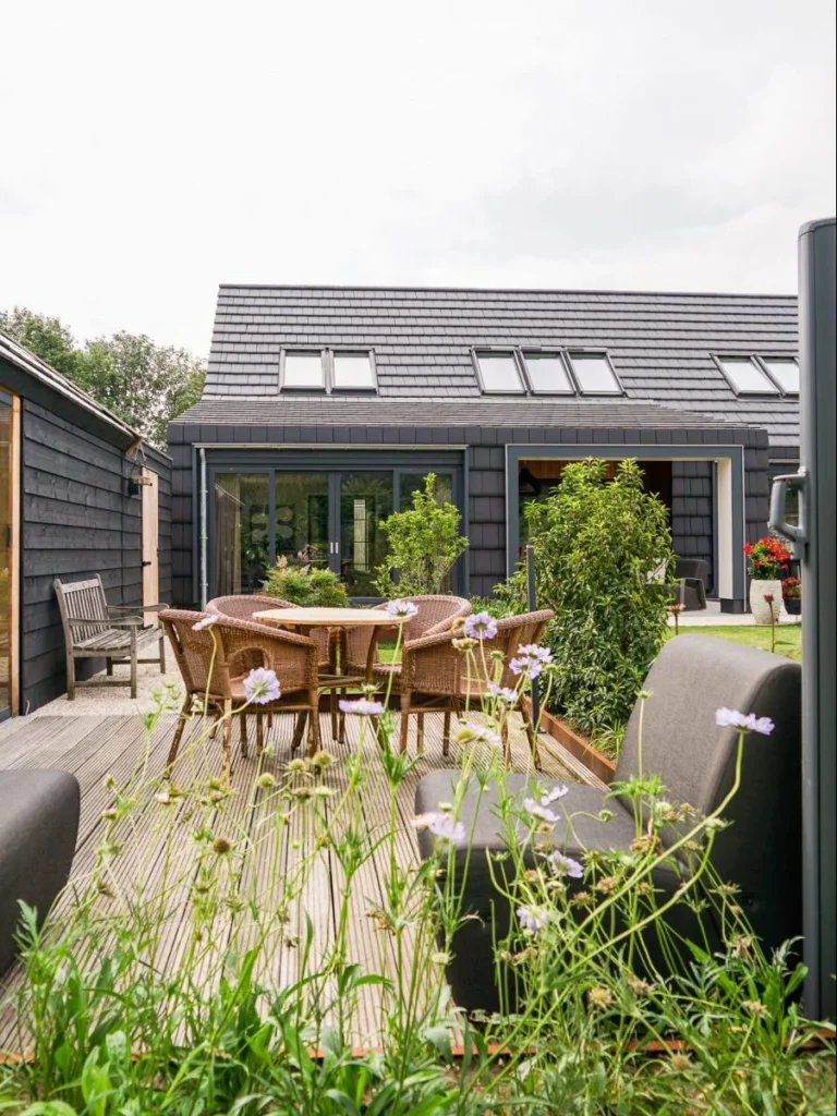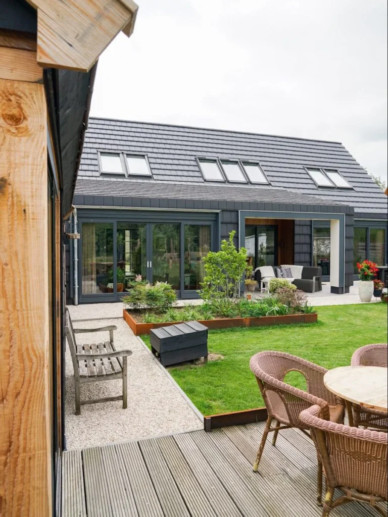 Mooie, landelijk gelegen schuurwoning. Strakke basisvorm met sfeervolle overkapping aan de achterzijde. De combinatie van steen, hout en platte dakpannen welke doorlopen over de gevels geeft een mooi resultaat.