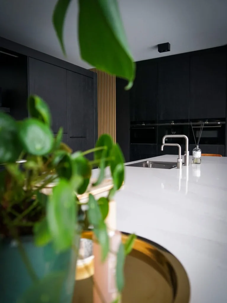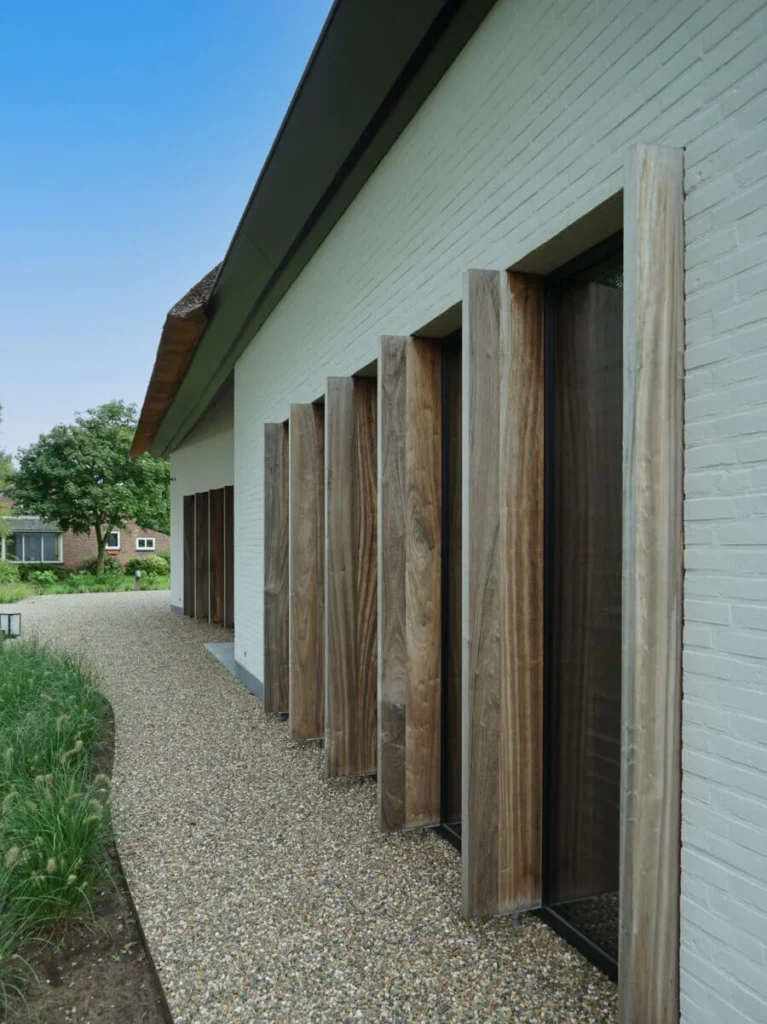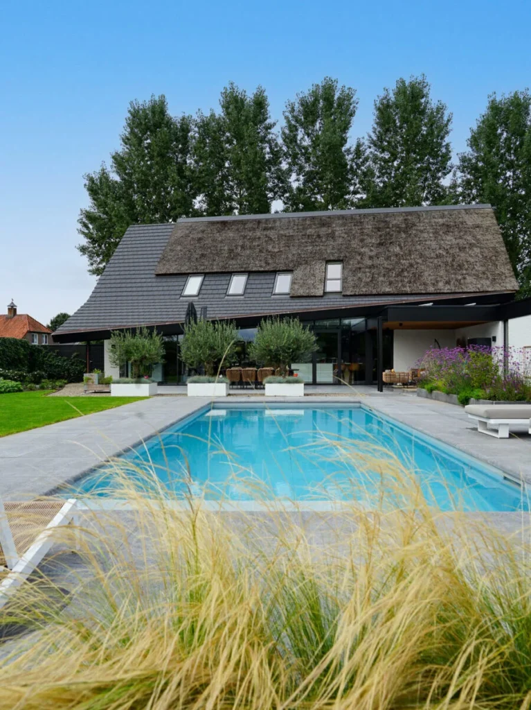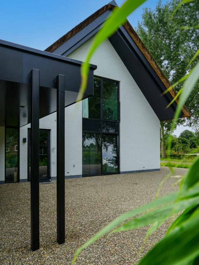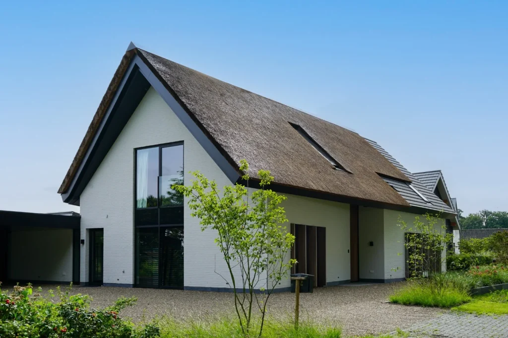 Deze moderne, duurzame woning bouwden we in Nuenen. Een fraaie woning met bijzondere detaillering. Zie bijvoorbeeld de overgang van het riet naar pannen op het dak met de verschillende schuintes.