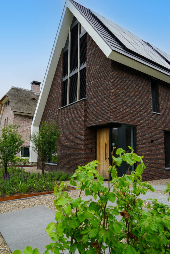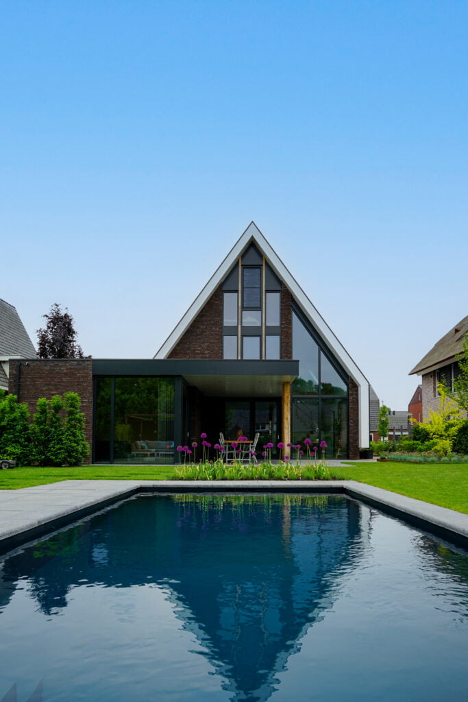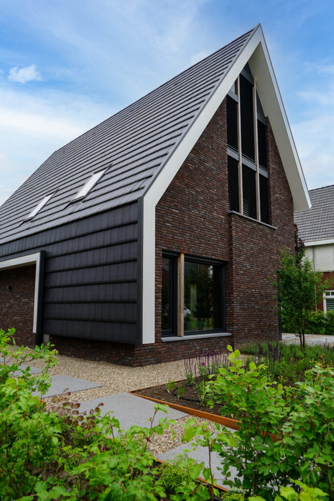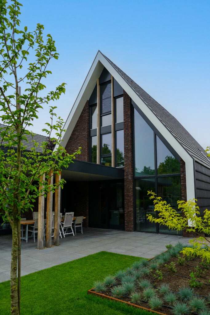 Deze woning bouwden we in Sint-Oedenrode en is een moderne interpretatie van de jaren ’30-stijl. Dit zie je terug in de steile kap, de rode baksteen en witte overstekken. Door de kap helemaal om de woning heen te vouwen, komt de focus vanzelf op de voor- en achterzijde te liggen. Aan de voorzijde is de goot bij de entree wat hoger, wat een uitnodigend beeld geeft. Aan de achterzijde wordt de aandacht met de vide en de grote glazen pui volledig op de achtertuin gericht. Heerlijk wonen!