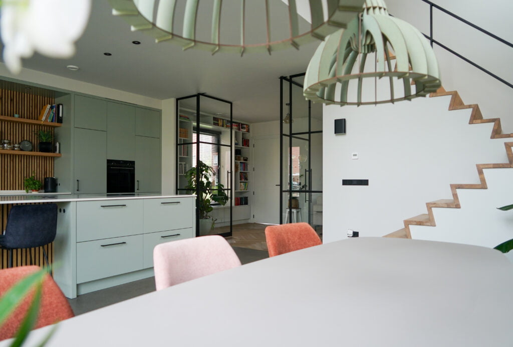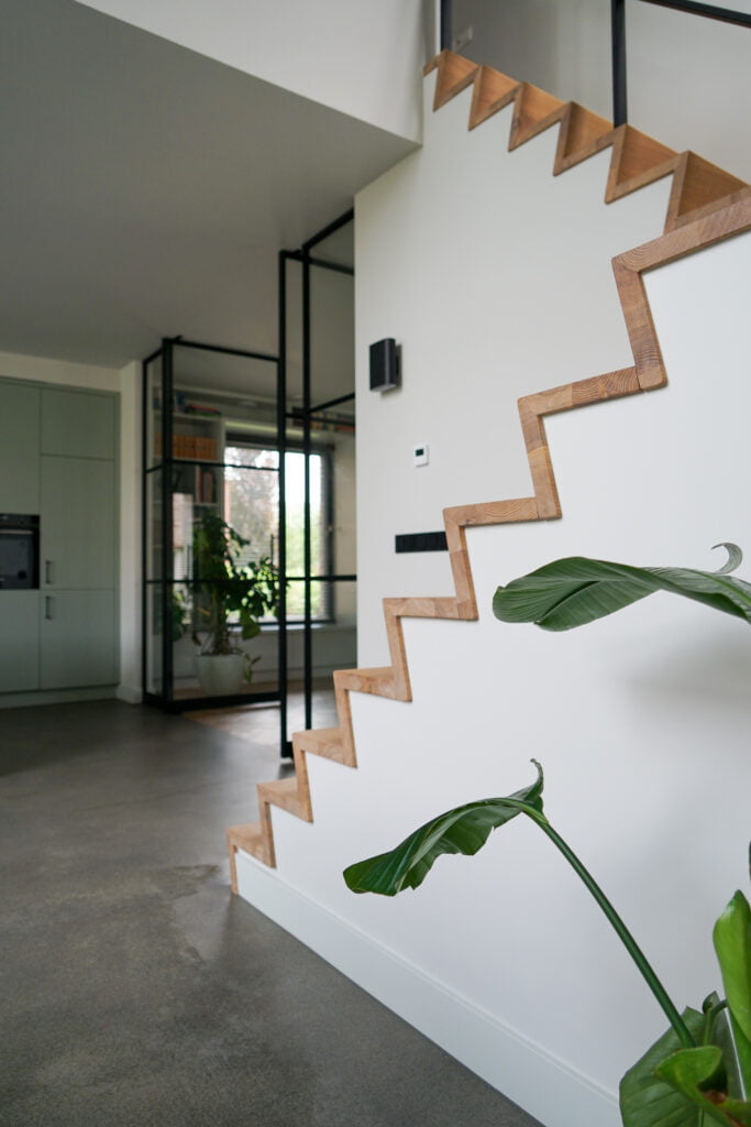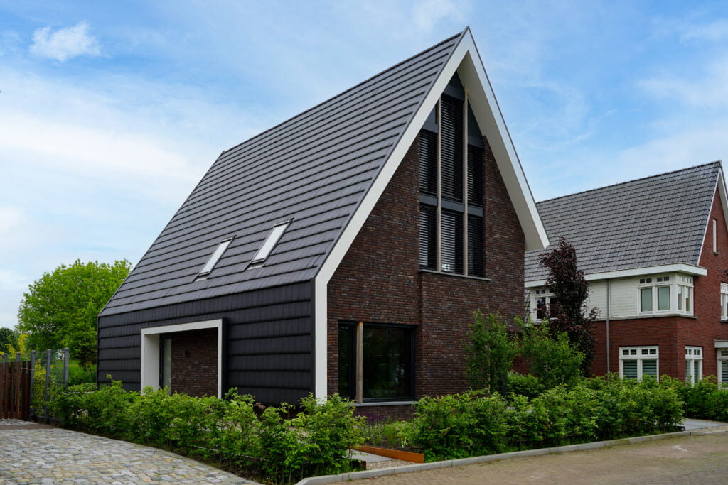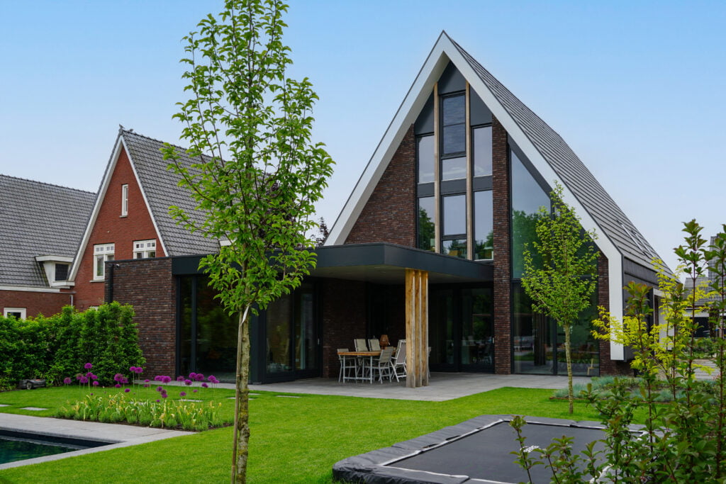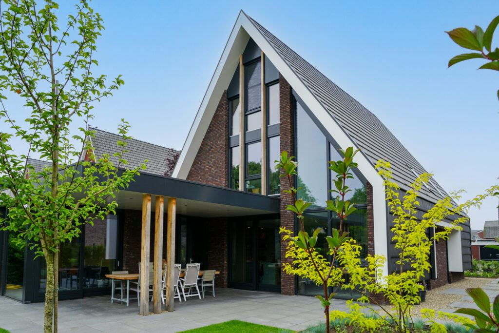 Deze woning bouwden we in Sint-Oedenrode en is een moderne interpretatie van de jaren ’30-stijl. Dit zie je terug in de steile kap, de rode baksteen en witte overstekken. Door de kap helemaal om de woning heen te vouwen, komt de focus vanzelf op de voor- en achterzijde te liggen. Aan de voorzijde is de goot bij de entree wat hoger, wat een uitnodigend beeld geeft. Aan de achterzijde wordt de aandacht met de vide en de grote glazen pui volledig op de achtertuin gericht. Heerlijk wonen!