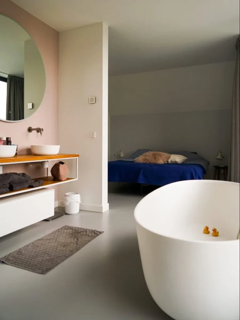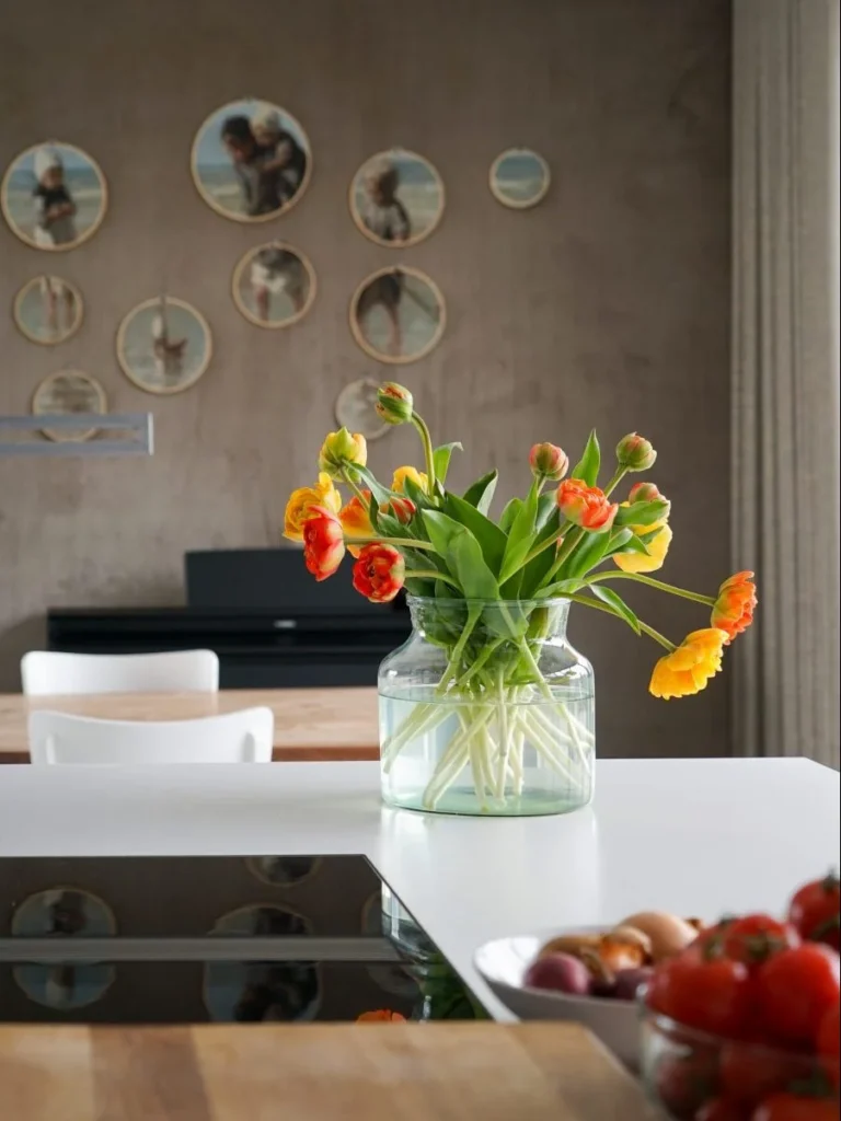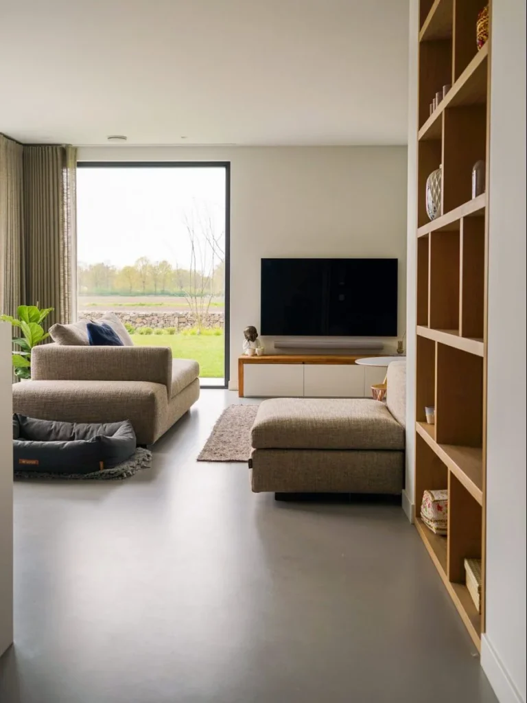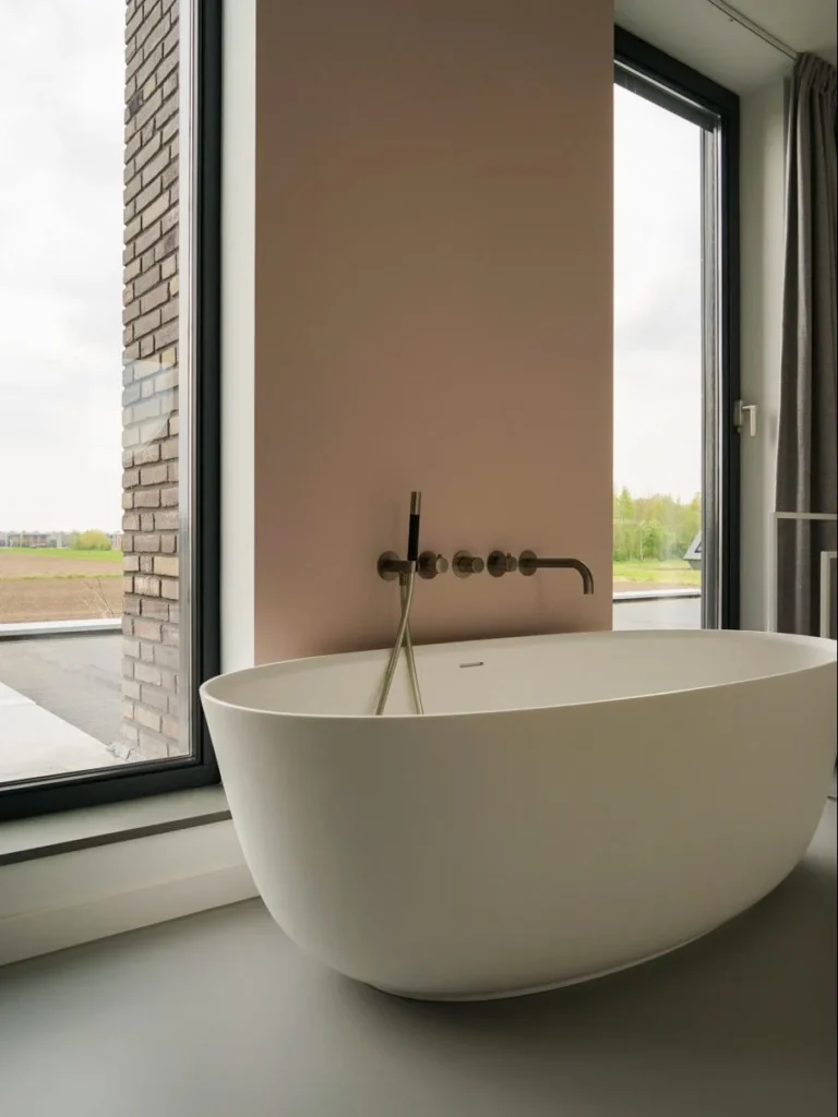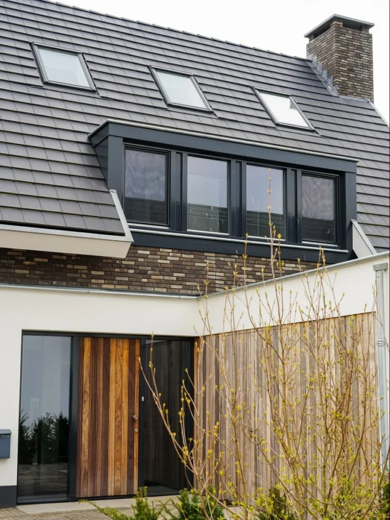Een mooie villa, moderne architectuur met strakke lijnen en landelijke invloeden. De grote ramen en kozijnen tot in de nok geven veel lichtinval. Deze woning in Vlijmen (bij Den Bosch) heeft een robuuste schoorsteen. En daarnaast een mooie variatie in materialen door de combinatie van stucwerk, steen en hout.
