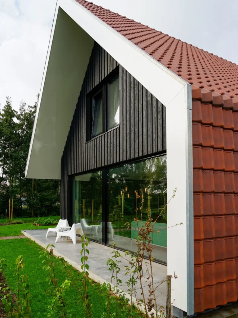 Moderne schuurwoning op Veghels Buiten. De rode pannen lopen door over 1 zijde van de woning. En geven een mooi contrast met de zwarte gevelbekleding en witte overstekken.