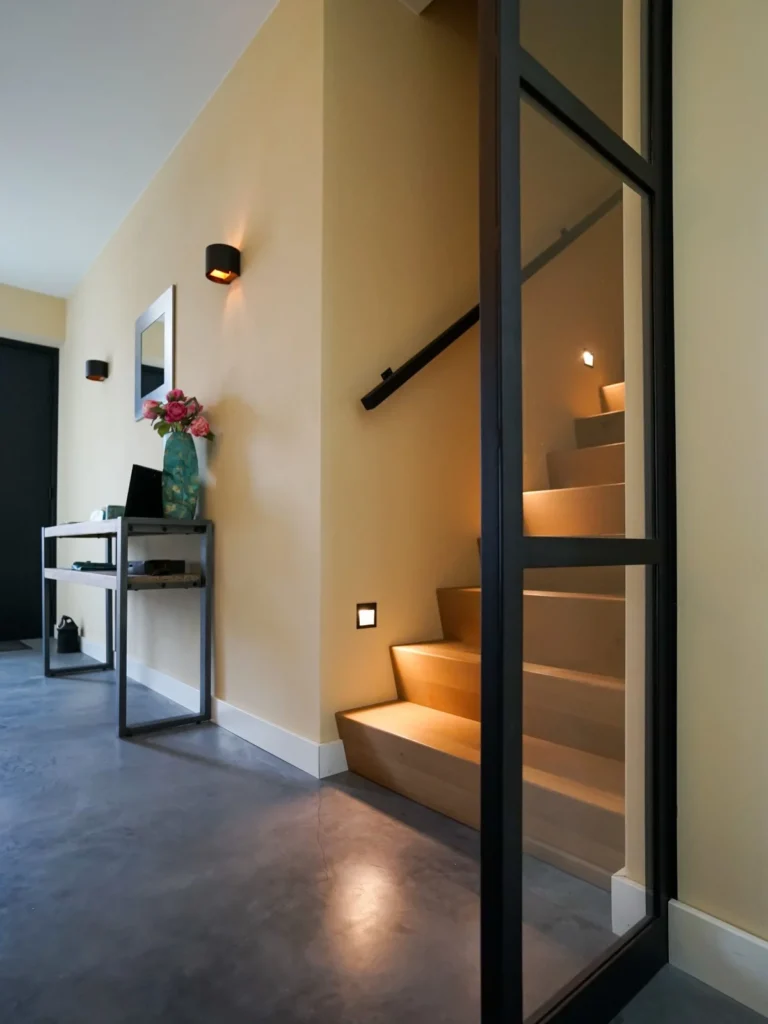 Binnen en buiten lopen in elkaar door, door onder andere de betonvloer. Binnen ligt er een gevlinderde betonvloer, eigenlijk zoals die ook in schuren en bedrijfshallen ligt. Dat past bij het uitgangspunt om het te houden bij de basis. De vloer kent natuurlijk wel het comfort van een vloerverwarming. En onder andere de in het dak geïntegreerde zonnepanelen zorgen voor de energiezuinigheid.